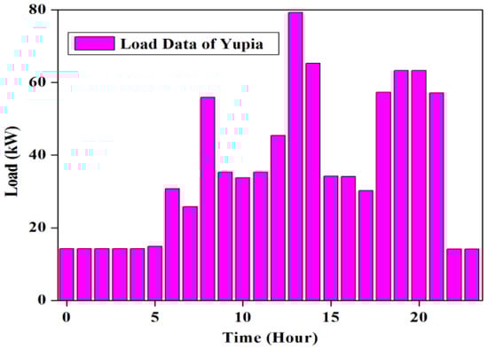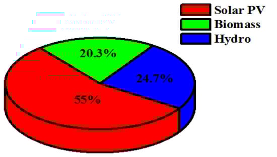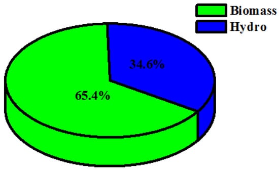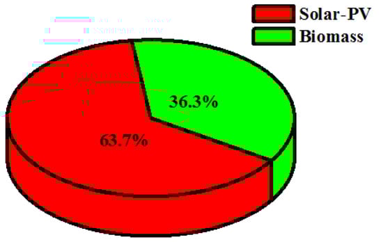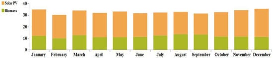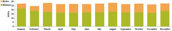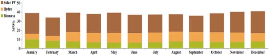 Depending upon the massive potential for biomass which generally comes from Yupia’s huge bamboo reserves and other forest vegetation, the energy produced from a biomass-based generator (BGS) on an hourly basis can be indicated by Equation (6) [], where  represents the time in hours for a particular day.