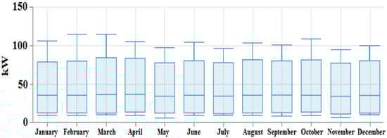 The presence of a very low population in Yupia makes the demand for domestic load very low. Since the generation of power will be carried out near the specified hilly town, it is supposed that, with time, there will be increment in load. Hence, the load takes into account the future necessities. The data related to the domestic load are taken from the local center office of the Department of Power, Government of Arunachal Pradesh []. The considered load comprises households, one health center, local shops, one degree college, one secondary school, a water-pumping station, one administrative office, street lights and one police check post. Figure 3 indicates the hourly distribution profile of the load consumption for the remote hilly town under study. The estimated overall load as consumed on a daily basis in the proposed location is 860.70 kWh/day with a peak value of 126.48 kW, while the yearly consumption of load calculated from HOMER [] is found to be 314,060 kWh/year. Figure 4 indicates the monthly distribution profile of the load consumption for Yupia. It is observed from Figure 4 that, from 10 p.m.to 11 p.m. and 12 a.m. to 5 a.m., the load demand is very low, and, from 6 a.m., the load demand gradually rises while at 1 p.m. it reaches the highest peak. Thereafter, from 3 p.m. to 5 p.m., the demand becomes approximately constant and then it rises again from 6 p.m. to 9 p.m.