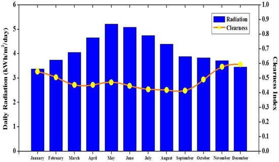 The remote hilly town of Yupia has a huge potential for available renewable-based resources, viz., (i) solar irradiance, (ii) sufficient stream flow of the Dikrong River and (iii) biomass resources available from bamboo and other forest vegetation. In this study, the availability data of stream flow for the Dikrong River and the solar irradiation of Yupia are from the year 2021. Depending upon the geographical locational data (i.e., latitude and longitude) provided, HOMER Pro computes the global horizontal index (GHI) of the solar radiation and the optimized size of the integrated energy system. The daily radiation in kWh/m2/day, clearness index and daily temperature data of the specified location are accessed by the HOMER Pro software from the database of NASA Surface Meteorology and Solar Energy [].