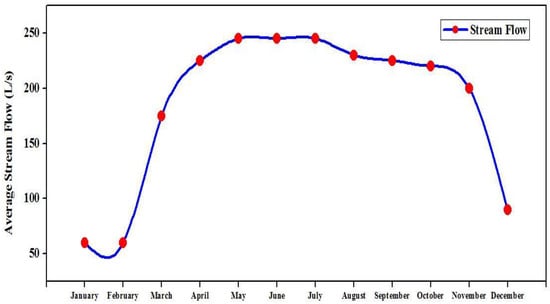 The Dikrong River is a distributary of the Brahmaputra River, which flows in the Indian state of Arunachal Pradesh as one of the major rivers. The available monthly average stream flow of the Dikrong River is indicated in Figure 6. The stream flow data of the Dikrong River is accessed from the local center office of Arunachal Pradesh Energy Development Agency (APEDA) []. Annually, the average stream flow is found to be 185 L/s, with the highest average stream flow for the months May, June and July (245 L/s) and the lowest stream flow for the months January and February (60 L/s).