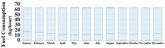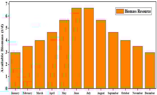 The hilly town of Yupia has a massive potential for biomass which generally comes from its huge bamboo reserves and other forest vegetation. Biomass resource availability data have been collected from []. Annually, the area has an average biomass reserve of 4.59 tons/day (t/d). The available monthly average biomass resources of Yupia are indicated in Figure 7.