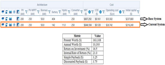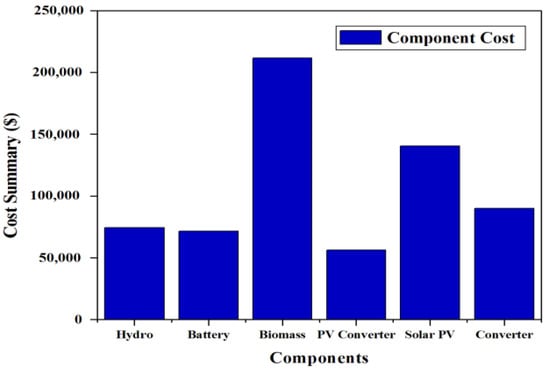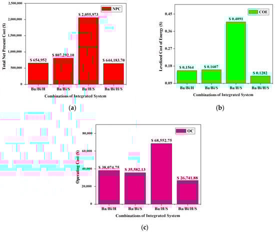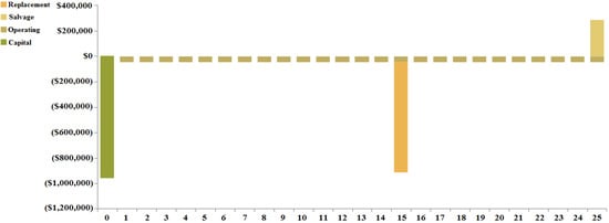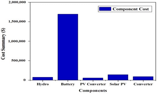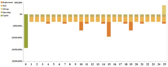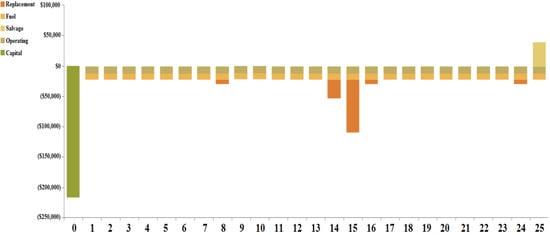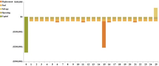 The net present cost (NPC) of a component represents the current price related to its installation and operation within the lifetime of the IES project subtracted from the current price related to the earned revenues within the lifetime of the IES project. An NPC generally comprises costs such as: capital, fuel, operation and management (O&M), replacement, etc. Therefore, the NPC of the total system as well as every component used in the IES is computed in HOMER environments and expressed by Equation (9) [].