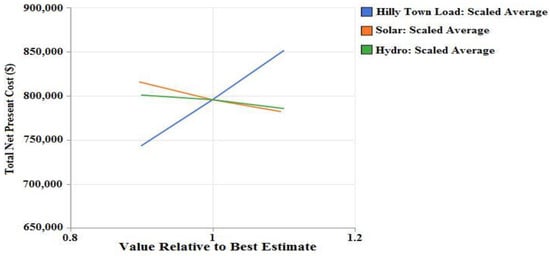 A sensitivity study for variation in electrical-based load, irradiance on solar-PV and hydro stream flow is showcased in Figure 30. The plot represents the deviation in NPC with contrast to electrical-based load, irradiance on solar-PV and hydro stream flow. In this case, a deviation from the mean value of irradiance on solar-PV and hydro stream flow of 12% respectively is considered, whereas a 10% deviation is considered for electrical-based load. It can be concluded from Figure 33 that the sensitivity with regard to NPC due to electrical-based load is the highest, whereas the NPC due to irradiance on solar-PV is the lowest. Hence, if there is a small deviation in the electrical-based load, then the NPC varies largely because of its elevated slope. Further, it can be seen from Figure 33 that the effect of the hydro stream flow on the integrated system’s NPC tends to contrast the irradiance on solar-PV as, with the slight alteration in the mean value of the irradiance on solar-PV, its effect over the system’s NPC remains unaltered.