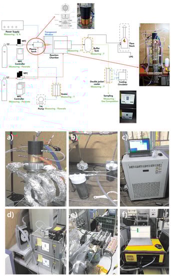 Schematic diagram of plasma reaction system and analyzer set-up. (a) Pre-heater for C12H26, (b) carbon filter, (c) cooling water supply, (d) online IR analyzer and dry gas meter, (e) liquid supply syringe pump, (f) FT-IR analyzer.
