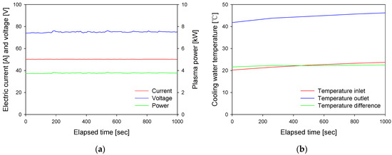Plasma power could be controlled through the applied current and plasma transfer gas flow rate, and characteristics of the plasma discharge were investigated under low-power conditions using a 10 kW scale plasma torch. Under the constant current condition, the plasma discharge shows stable and relatively constant voltage and coolant temperature change, as shown in Figure 4.