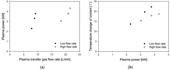 The effects of the applied current and the flow rate of the plasma transfer gas on the plasma power and coolant temperature are shown in Figure 5 and Figure 6, respectively.