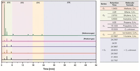 The product gas consists only of hydrogen and hydrocarbon gases, and as a result, it can be confirmed that turquoise hydrogen can be produced through this process without generating carbon oxides such as CO and CO2. After the gas flow rate and composition were stabilized, the generated gas was sampled, and the composition of gaseous hydrocarbons was analyzed from C1 to C5. The GC-FID peak analysis results and reference retention time are shown in Figure 8.