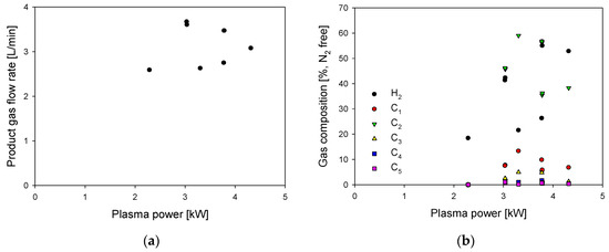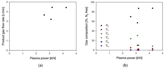 Effect of plasma power on (a) product gas flow rate and (b) gas composition using upward plasma.