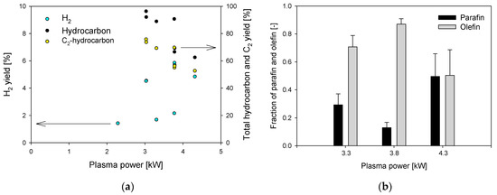 As the plasma power increased, the hydrogen yield increased up to 5.8%, while the total hydrocarbons and C2 yields tended to decrease from 96% to 62% and from 76% to 53%, respectively. The olefin content of the total hydrocarbons was determined to be about 50 to 90%, and the yield of ethylene, a C2-based olefin, corresponded to approximately 25 to 58%, which was similar to the results of the existing literature [12,13]. As a result, it is possible to confirm the production of olefins that can be used as the main raw materials for various chemical processes along with the production of clean turquoise hydrogen.