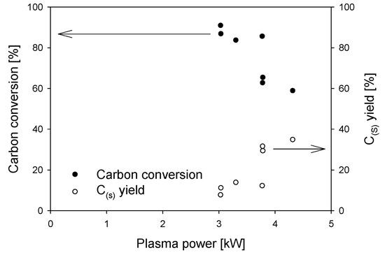 The carbon conversion tended to decrease with increasing plasma power, while the yield of solid carbon increased from about 8% to 35%. The decrease in the amount of hydrocarbons in the product gas and increases in the hydrogen and solid carbon yields can be due to the increase in an additional thermal decomposition of gaseous hydrocarbons as the plasma power increases.