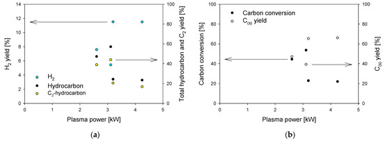 As the plasma power increased under the plasma upward supply condition, the flow rate and hydrogen content of the product gas tended to increase and maintained relatively high levels of about 4.4 L/min and 87%, respectively, compared to the downward supply condition. On the other hand, the total hydrocarbon content decreased from about 40% to 13% with increasing the plasma power. Product yield distributions and carbon conversion are shown in Figure 13