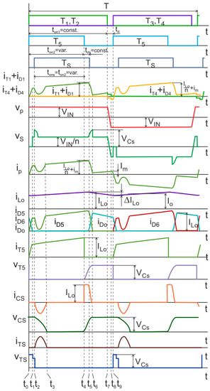 The primary transistors T1–T4 are controlled by PWM with a constant frequency of 50 kHz and 50% duty cycle with 1 µs dead-time. The secondary transistor T5 is switching with a double switching frequency of 100 kHz and a variable duty cycle. This provides control over the output power of the dc-dc converter. The transistor T5 is turned off before the primary transistors. This technique decreases the primary current to the value of the magnetising current and helps to remove the circulating current on the primary side. The output capacitance of the primary transistors is discharged by the magnetising current during the dead-time interval. This ensures ZCS and ZVS on the primary side of the converter. The snubber transistor TS has the same switching frequency as the transistor T5. It enables discharging of the snubber capacitor CS to the load. The snubber capacitor CS absorbs the energy of the leakage inductances of the transformer during transistor T5 turn-off and creates a ZV turn-off condition for the transistor T5. The operation of the proposed soft-switching dc-dc converter can be divided into nine intervals within one half-period of operation, which is depicted in Figure 2. The corresponding scheme for each operation interval is shown in Figure 3.