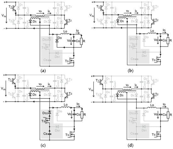 The ZV turn-on of the primary transistors T1–T4 is achieved by discharging their output capacitances during a dead-time interval by the magnetising current of the transformer. The proper value of the magnetising current is guaranteed by the precise design of the high-frequency transformer TR. The transistor T5 would have significant switching losses if no snubber was implemented. Thus, an active turn-off snubber consisting of a snubber transistor TS, two snubber diodes DS1 and DS2 and a snubber capacitor CS is proposed in the paper. Its main task is to minimise the turn-off losses of the transistor T5, absorb the energy of the transformer leakage inductance and recover the absorbed energy to the load. Compared to other similar designs [9,10,11,12,16,18], the proposed turn-off snubber uses only one capacitor and utilizes parasitic elements of the circuit.