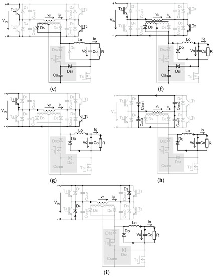 Converter operation in time intervals: (a) interval t0–t1, (b) interval t1–t2, (c) interval t2–t3, (d) interval t3–t4, (e) interval t4–t5, (f) interval t5–t6, (g) interval t6–t7, (h) interval t7–t8, (i) interval t8–t9.