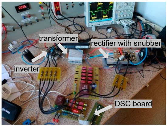 Ultrafast soft recovery diode 150EBU04 was used for the rectifier (D5, D6) and the snubber diodes (DS1, DS2). The laboratory model (Figure 4) was controlled by TMS320F28335 DSP by Texas Instruments. The control algorithm uses fixed gating pulses for primary and secondary transistors, as there was no control loop implemented.