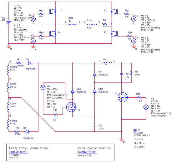 The simulation was performed in OrCAD/PSpice for nominal operating values of the dc-dc converter. The simulation scheme is shown in Figure 5. This section describes the basic characteristics and simulation time waveforms of the dc-dc converter.