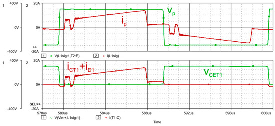 Primary voltage vp and primary current ip (upper); collector voltage of transistor T1 vCE(T1) and current of transistor T1 and diode D1 iC(T1)+iD1 (lower).