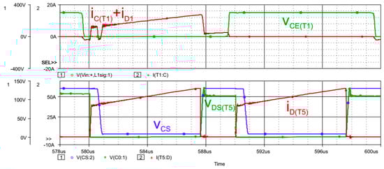 The collector voltage of transistor T1 vCE(T1) and the collector current of transistor T1 and diode D1 iC(T1)+iD1 (upper); the drain voltage of transistor T5 vDS(T5) and current of transistor T5 and diode D1 iD(T5) (lower).