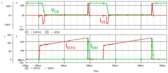 Current of snubber capacitor CS iCS and its voltage vCS (upper); drain current of transistor T5 iD(T5) and current of snubber diode DS iDS (lower).
