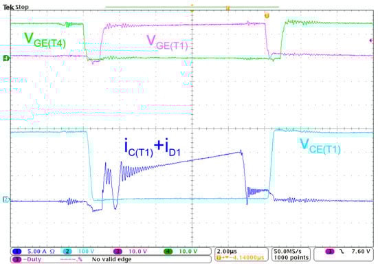 Time waveforms on the primary transistor T1: gate voltage of transistor T1 vGE(T1) and T4 vGE(T1), the collector voltage of transistor T1 vCE(T1) (100 V/div.) and the collector current of transistor T1 and diode D1 iC(T1)+iD1 (5 A/div.).