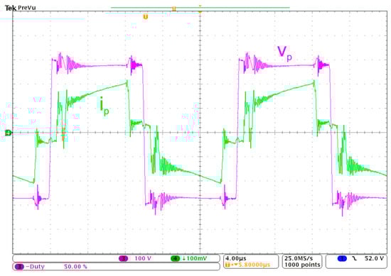 Time waveforms on the primary side of the transformer: the primary voltage vp (100 V/div.) and the primary current ip (5 A/div.).
