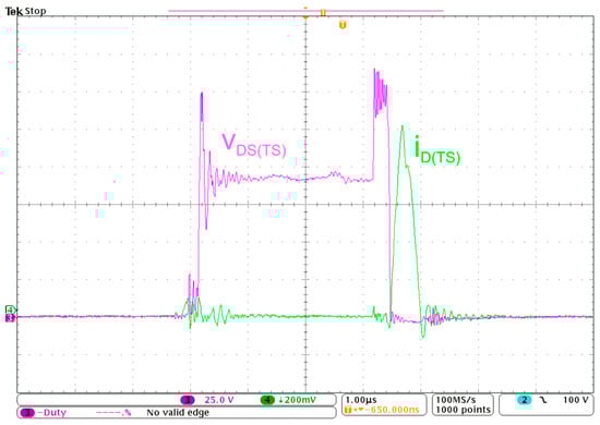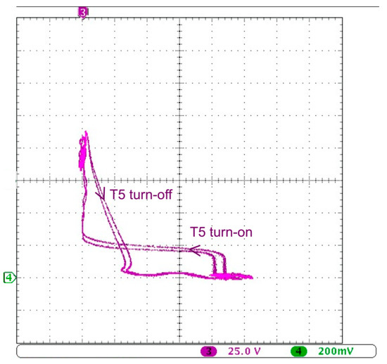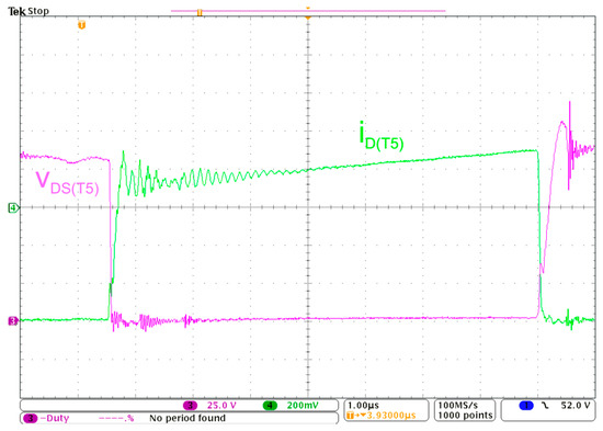 Switching on the secondary side is divided between the rectifier transistor T5 and the snubber transistor TS. The switching of the rectifier transistor is shown in Figure 12. The rate of rise of its drain current is limited by the leakage inductance of the transformer, and it turns on with ZC condition. Its duty cycle controls the energy flow to the load and is limited by the duration of the time interval t4–t6 needed for charging the snubber capacitor CS. The transistor T5 is turned on with ZC condition. This is guaranteed by the leakage inductance of the transformer as it limits the commutation of the load current (time interval t0–t1 in Figure 2). At its turn-off, the rate of rise of its drain voltage is limited by the snubber capacitor CS, and thus is turned off under ZV condition (time interval t4–t5 in Figure 2). The small overvoltage at its turn-off is caused by the parasitic inductance in the commutation circuit, which cannot be minimised any further because of the discrete components used in the converter. The commutation circuit consists of the transistor T5, snubber diode DS1 and snubber capacitor CS. This is the most critical point of the prototype design in order to maintain the designed switching characteristics.