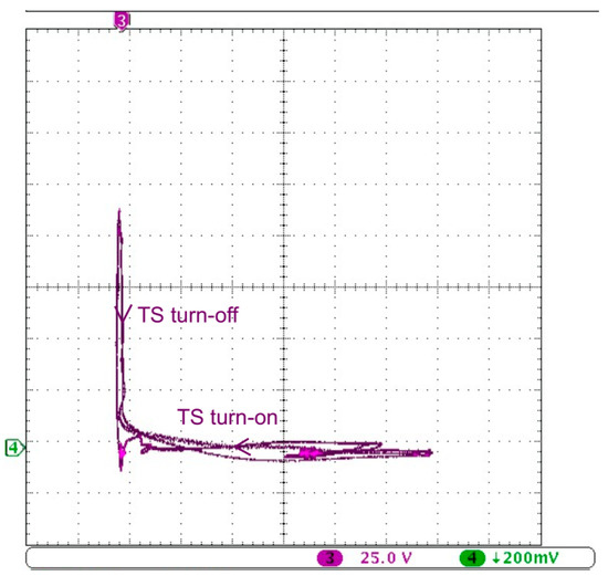 The soft-switching of the secondary transistor T5 is documented by the trajectory of its operating point, shown in Figure 13. The operating point remains away from the area of high switching losses. The snubber capacitor CS is discharged to the load through the snubber transistor TS. Its switching is shown in Figure 14. The transistor is turned on shortly after the primary transistors. Its drain current is created by a resonant half-period of the discharging current. Thus, it is turned on and off under ZC condition in a resonant way. Its switching is thus completely soft and is documented by a switching trajectory shown in Figure 15. The measured switching waveforms of the secondary side transistors are in accordance with the simulation (Figure 8 and Figure 9).