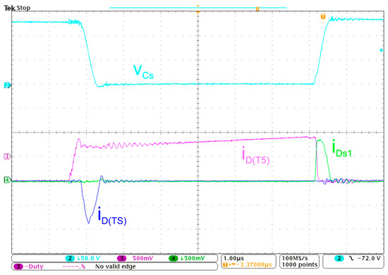 The measurement of the proposed energy recovery snubber is shown in Figure 16. The snubber capacitor CS is charged to the full voltage from the previous half-period before the transistor T5 is turned on. The snubber capacitor needs to be discharged before the secondary transistor T5 is turned off. Its discharge is initiated by the turn-on of the snubber transistor TS shortly after the turn-on of the secondary transistor T5. This will transfer the energy from the snubber capacitor to the load and subsequently decrease the primary current.