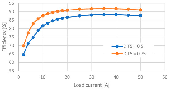 The efficiency of the proposed soft-switching dc-dc converter was measured for two different values of the duty cycle of the secondary transistor T5 and constant supply voltage VIN (Figure 17). The load current was controlled by an electronic load and the efficiency was measured by a precision power analyser.