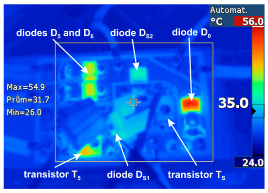 The maximum efficiency of the converter was limited mainly by the free-wheeling diode D0. The diode D0 conducts a significant part of the load current for smaller duty cycles of the secondary transistor T5, and its conduction losses make up a significant part of the total losses of the converter. The efficiency curve has a slight decline for higher output currents. This is caused by increasing conduction losses as the switching losses are minimised. Additionally, the losses of the free-wheeling diode D0 are mainly influenced by the duty cycle and not by a load current, as can be seen in Figure 17. The impact of the free-wheeling diode D0 losses is illustrated in Figure 18. The diode D0 is the component with the highest temperature even though it has the same heatsink properties as the secondary transistor T5. The increase in the duty cycle of the secondary transistor T5 significantly increases the overall efficiency of the converter. This drawback could be solved by applying a synchronous rectifier. The converter operates with low output voltage so the low-voltage MOSFET could be used instead of the free-wheeling diode. Another possibility would be to use a current doubler. However, it would complicate the application of the designed energy recovery snubber, and the control of the output voltage would have to be transferred to the primary side [26].