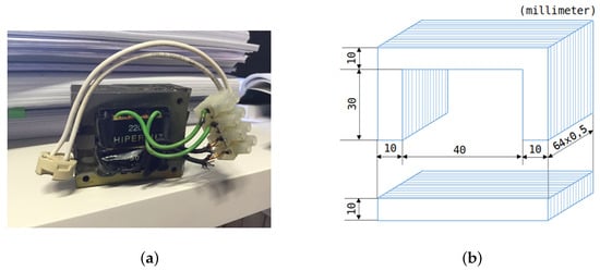 (a) Reused transformer from a halogen spotlight. (b) Main dimensions of the transformer cores, with removed winding and central iron column.
