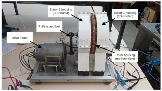 In this work, the stator iron cores proceed from six small transformers previously used in old-fashioned halogen spotlights (Figure 1a) that have been recently replaced by LED technology. The windings and the central iron column have been removed with cutting tools from the initial iron blocks, then the U and I cores needed for the TFM construction are obtained (Figure 1b). The welds between the U and I cores have also been eliminated by cutting. Moreover, the stator copper, the PMs, the rotor housing (made of methacrylate), and the mechanical support (axis, bearings, pulleys, and belt) come from different academic end-of-degree projects and master’s theses, and the drive motor is a starter DC motor from an old car. Finally, the stator housing is manufactured by 3D printing using polylactic acid (PLA), a widely used filament material in the field of 3D printing that is recyclable and biodegradable. Figure 2 shows an overview of the TPAGTFG prototype.