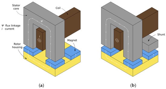 Figure 3a depicts one pole pair of a basic TFM in its linear version. The U-shaped stator core guides the magnetic flux from one PM to another, embracing the coil. Moreover, TFMs sometimes include some magnetic shunts, also named I cores or bridges (Figure 3b), that reduce the “negative flux” of the inactive magnets (those magnets that are not below the U cores in a given time). From this basic structure, a plethora of multi-pole and multi-phase TFM arrangements can be defined.