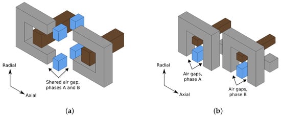 Single-phase topologies have been widely studied in the TFMs literature since the end of the 20th century, when TFMs started to gain more attention among researchers. Moreover, single-phase TFMs have no starting torque in motoring mode, as they usually work as synchronous machines. For these reasons, in this work single-phase TFMs have been dismissed. Moreover, most of the conventional three-phase TFMs in the literature show a stacking arrangement, i.e., three equal single-phase blocks that are axially stacked and circumferentially shifted in order to form an accurate multi-phase arrangement. This leads to TFMs with a high axial length, and this might not be adequate for some applications with space limitations, so other configurations should be investigated to address this problem. Consequently, among the two-phase topologies, the shared-gap arrangement (see Figure 5a) is preferred against the non-shared gap arrangement (Figure 5b), because the same air gap serves for both A and B phases, so the axial length of the machine might be reduced. Moreover, the PMs and the coil do not compete for the same space in a given slot size, potentially enabling higher electric and magnetic loadings.
