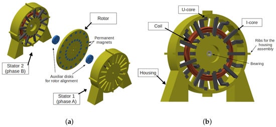 The CAD model of the proposed TPAGTFM is shown in Figure 6. The iron cores of phases A and B are shifted 90 electrical degrees in order to obtain an accurate two-phase arrangement. To minimize the rotor eccentricity, two disks made of methacrylate have been screwed to the rotor housing (see Figure 6a). Moreover, the stator housings have been divided into four parts due to limited space in the 3D printer plate, so they must be joined with screws through the ribs, as shown in Figure 6b. Due to 3D printing facilities, it is possible to leave some holes in the stator housing to improve the air circulation from the stator coils to the outside.