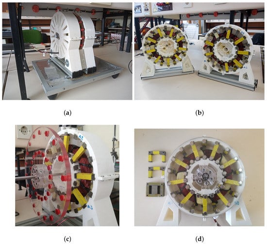 Detailed views of the TPAGTFG prototype: (a) overview, (b) the two stators with 90 electrical degrees shift, (c) one of the stators and the rotor during the assembly, and (d) stator and rotor with the iron cores, before and after removing the central iron column and the welds.