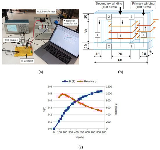 B-H curve measurement: (a) experimental setup, (b) magnetic circuit, and (c) B-H curve.