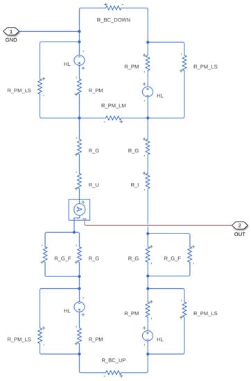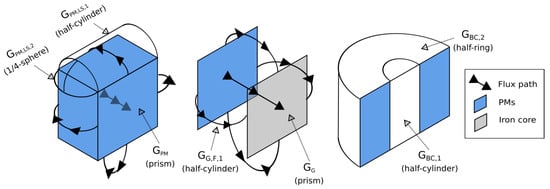 Magnetic equivalent circuits (MECs) are generally used in electric machines design and optimization due to their low computational cost, but their precision is lower than that of the FEM. When dealing with axial flux machines and transverse flux machines, the magnetic flux path is divided into volumes (prisms, cylinders, spheres, rings, and fractions of them) and the conductances (G) are calculated using classical formulae [39]. In this work, the following conductances have been used: prism with cross section and axial length g (14), half-cylinder of axial length L (15), quarter-sphere with diameter g (16) and half-ring with axial length L, inner diameter g, and width w with g (17). is the magnetic permeability.
