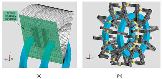 Figure 11 shows the meshed model of both the initial design and the prototype. The boundary conditions are: zero magnetic field at infinity (it is set by the FEM software through an “infinite box” transformation) and, for the initial design model, periodicity along the pole pairs (see Figure 11a). The prototype model (Figure 11b) has an angular shift of 130 electrical degrees between phases instead of 90 electrical degrees, so there is no angular periodicity and the whole machine must be modeled. As the magnetic flux paths are inherently three dimensional in TFMs, extruded mesh and second-order elements are a good combination in order to save computation time while obtaining accurate results.