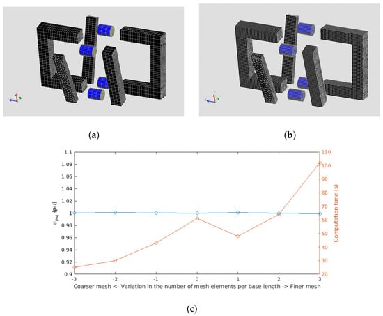 Furthermore, a mesh convergence analysis has been conducted over the initial design geometry to verify that the elements size does not affect the flux linkage value. The element size in a mesh line can be defined as a function of the number of elements in each coordinate, and subsequently the effects on the results can be analyzed through a parametric study. Figure 12 shows two cases in which the number of mesh elements along x, y, and z coordinates has changed. As the mesh has second-order elements, there are no appreciable deviations in the flux linkage values that are obtained, so the coarsest mesh can be used in the following simulations, thus saving computation time.