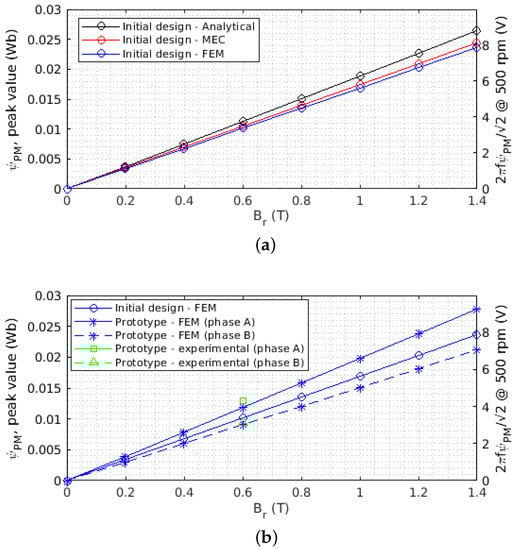 A magnetostatic FEM simulation has been run both for the “initial design” (with no defects) and the “prototype” (with misalignment and run-out fault) in order to compare the flux linkage and back-EMF values with the analytical calculations and the MEC. A parametric study has been conducted to evaluate the effect of the PM flux density, given by the PM material and the quality assurance in the manufacturing process, on the flux linkage and the back-EMF. Figure 13 shows the results, both for the initial design and for the prototype. As the air gap of the proposed TFM is large, the iron is not saturated and the PMs flux linkage turns out to be linear with the remanent flux density: the same results have been obtained with FEM with linear and nonlinear iron.
