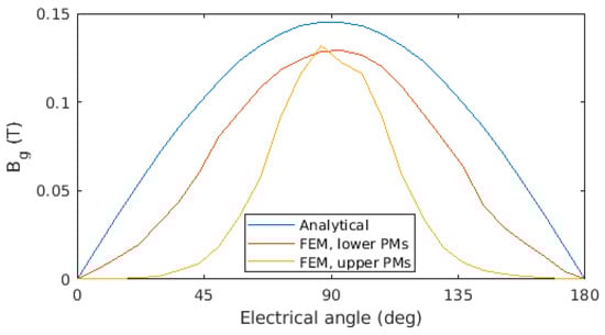 According to Figure 13a, in the initial design and with no defects, the MEC and the FEM show a very good agreement, and the analytical values are near 12% higher than the FEM results. Therefore, in the proposed TPAGTFG prototype the flux linkage is mainly determined by the remanent flux density of the PMs, the PMs volume, and the air gap length, but the leakage, fringing, and back-coupling paths seem to have a significant impact on the magnetic field distribution. In any case, their effects have been well captured by the proposed MEC. The FEM simulation also shows that the flux density in the air gap () is not sinusoidal (see Figure 14), as the previous first-harmonic analytical calculation assumes, and in fact the flux density waveform is not the same in the lower and upper PMs: the pole pitch length is 1.8 times higher in the upper PMs, and it affects the magnetic field distribution via leakage and fringing. Moreover, the peak value of the flux density is 12% higher in the analytical waveform; it is the same deviation as in the flux linkage.