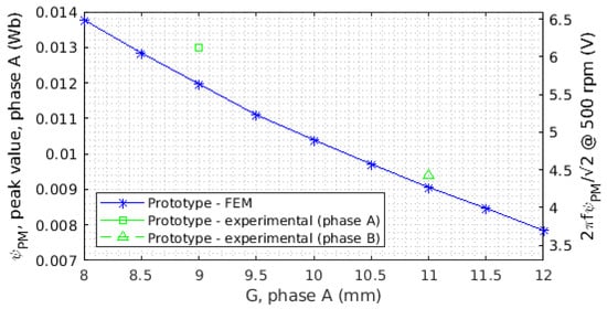 In Figure 13b the results of the FEM model of the “prototype” have been depicted, together with the experimental results—in the latter case the flux linkage has been calculated from the no load test with (13). The misalignment and the run-out fault lead to a deviation from the “initial design” FEM model about 17% in phase A and −10% in phase B. Moreover, the FEM model of the “prototype” shows good agreement with the experimental results: −8.5% error in phase A and −3.7% in phase B. The differences between phase A and phase B in the FEM model with respect to the real prototype could be attributed to some uncertainty when measuring the air gap in the assembled prototype with the caliper, considering that the air gap length is both affected by the run-out fault and the inclined rotor fault. Figure 15 shows a FEM analysis with respect to the air gap length: 9 and 11 mm were adopted in the prototype characterization, but according the to the FEM model, the real air gaps of the prototype might be around 8.4 and 10.7 mm.