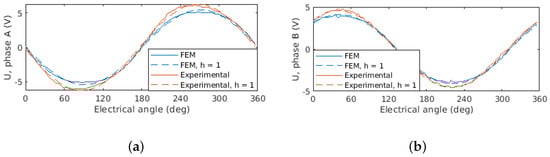 Back-EMF waveforms of the FEM simulation and the experimental results of the prototype: (a) phase A and (b) phase B.