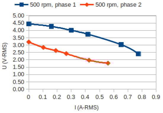 Figure 16 shows the test bench for the TPAGTFM experimental validation. No load and load tests have been conducted, the former to analyze the flux linkage and the back-EMF, and the latter to obtain the output voltage with different resistive loads (unity power factor test). In Figure 17, the back-EMF waveforms from the FEM model and the experimental tests have been depicted. It is shown that the back-EMF is sinusoidal and the peak value is slightly higher in the FEM model, as previously discussed. Moreover, it is shown that the there is a shift between phase A and phase B around 130 electrical degrees, thus confirming the angular misalignment that was detected during the prototype characterization. The misalignment between phases could be reduced with more precise machining tools or with a more resistant material against machining. Table 8 and Table 9 show the comparison of the flux linkage and back-EMF results from different methods. The error with respect to the prototype measurements is lower than 10% in all cases except the MEC in phase A and the analytical calculation in phase B, where the error is near 20% and the machine defects were not considered. Finally, Figure 18 shows the output voltage and current in the unity power factor test (resistive load). The current density is lower than 0.5 A/mm2, so the temperature raise due to copper losses does not affect the PLA stability. There is a significant difference between phase A and phase B outputs due to the eccentricity of the rotor, and it should be carefully controlled in future models of the prototype with the use of more precise manufacturing equipment. The synchronous inductance (L) can be calculated from the no load and load tests using the equivalent circuit of a synchronous machine (29), and the obtained value is 8.5 mH, similar to the characterization value shown in Table 4. As the rotor has no iron or SMC poles, the stator inductance is not affected by the rotor position.