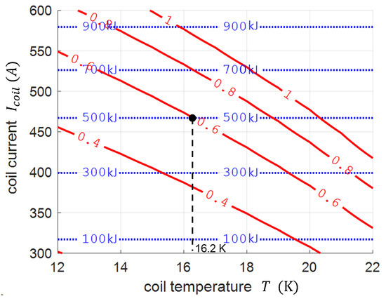 The temperature T and the coil’s current (via the magnetic field) affect the conductor’s critical current. Hence, a different is obtained depending on the operating conditions. The curves with the designed coil’s constant ratio are shown in Figure 2 as a function of the operating temperature and current. The curves with constant deliverable energy are also shown in the same plot. Since, according to Equation (1), the deliverable energy does not depend on the operating temperature but only on the current, these latter curves appear as horizontal lines in the T vs. plane. A target value of was chosen during the coil design as a compromise between an appropriate safety margin and a reasonable usage of a superconductor. It can be seen from Figure 2 that in order to not exceed the chosen margin of 0.6 in the most severe operating condition, when the SMES is fully charged at 467 A, the operating temperature of the coil must not exceed 16.2 K.