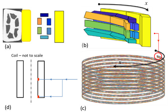 (a) Micrography and 2D geometrical model of the MgB filaments and the copper strip. (b) 3D geometrical of a short conductor’s length. (c) Geometrical model of 10 turns. (d) Two considered positions (at the middle and the bottom of the innermost layer) of the 10 turns within the coil.
