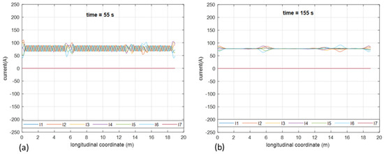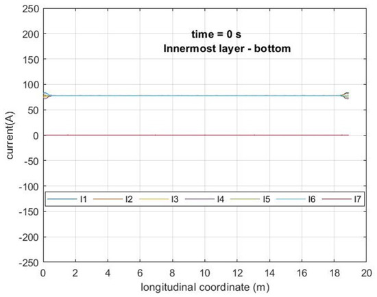 In Figure 7, the current of the filaments in ten turns placed at the bottom of the inner layer at s, immediately before the start of the discharge, is shown. All over the length of the conductor forming the turns (about 19 m), the total current of the coil (467 A) is uniformly distributed among the superconductor filaments that carry 77.8 A each. No current circulates in the copper strip. Furthermore, no transverse current circulates in the nickel matrix, creating the coupling of the superconductor filaments in this condition. In Figure 8a, the current distribution in the ten turns at s, when the coil’s current reaches 376.3 A and 35% of the stored energy (200 kJ) is discharged, is shown. In Figure 8b, the detail of the distribution over a conductor length of three twist pitches is shown. During this fast-ramping regime, the current is not uniform. In particular, due to the fast-ramping magnetic field investing the conductor, continuous (along the length) circulation of transverse currents occurs which creates the coupling of the filaments. Due to the high resistivity of the Monel sheath surrounding the superconductor filaments, no substantial current is observed in the copper strip. The distribution is periodical with the twist pitch. The coupling currents can be envisioned as current loops crossing the nickel matrix and reclosing in the superconductor filaments, where they sum or subtract to the transport current. As a result, the filaments experience a continuously changing (along the length) current that goes much beyond the uniform current share (that in this case would be 62.7 A per filament, giving the total transport current of 376.3 A), reaching about 200 A. The current is even reversed in the positions where the loop current subtracts from the transport current reaching A. The same behavior discussed above regarding the discharge is also obtained during the recharge. After the ramping cycle, when the coil’s current reaches the steady state again, the induced electromotive force no longer exists, and the transverse current flowing in the resistive matrix relaxes. The profiles of the filaments’ current gradually return to the uniform distribution holding before the ramping (Figure 7): Figure 9a,b shows the current distribution in the ten turns at s when very substantial relaxation has already occurred and at s when relaxation is practically completed, respectively.