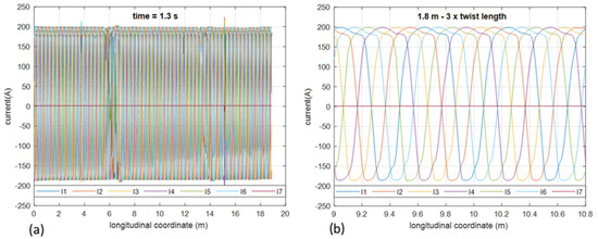 (a) Current of the filaments in ten turns at s. The total current of the coil is 376.3 A. (b) detail of the current over a conductor length of three twist pitches ( m) at the middle of the ten turns. Currents denoted from to are the currents of the superconductor filaments. Current is the current of the copper strip.