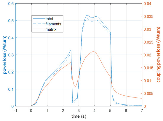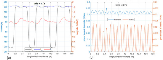 As discussed, due to the transverse coupling currents, the current of the filaments goes far beyond the critical value, bringing the superconductor to the dissipative state. This is the main reason for the loss occurring in the conductor. The transverse currents through the resistive nickel matrix also contribute to the total loss, but their impact is much lower. In Figure 10a, the local current of the first filaments () is compared with its critical current () over a conductor length of three twist pitches. The local value of magnetic flux density acting on the conductor () is taken into account for calculating the critical current and is also shown in the figure. The corresponding loss per unit length of the conductor is shown in Figure 10b. It can be seen that the loss in the matrix materials (nickel and Monel sheath) due to transverse current is much lower that the loss in the filaments. It is also pointed out that since negligible current flows in the copper strip and in the Monel matrix, no significant loss is produced therein; thus, practically all of the matrix loss is produced in the nickel.